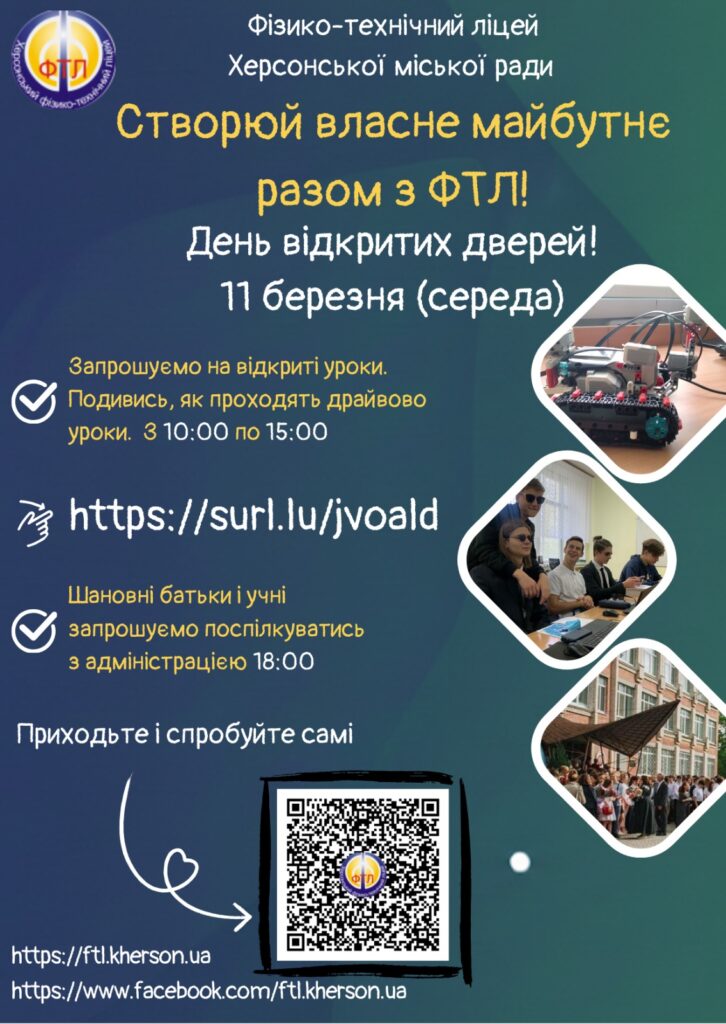Запрошуємо учнів 9 класів та їхніх батьків на День відкритих дверей Фізико-технічного ліцею Херсонської міської ради.
